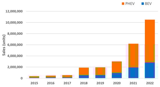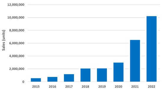 The global electric vehicle (EV) market has experienced remarkable growth over the past decade. As shown in Figure 1 below, global EV sales skyrocketed from just over 550,000 units in 2015 to over 10.2 million units in 2022, an 18-fold increase in only 7 years []. EVs accounted for close to 9% of total passenger vehicle sales worldwide in 2021, up from only about 1% just 5 years earlier []. This rapid growth has been driven by several key factors, including improving technology, lower battery costs, supportive government policies, and expanding model availability. During 2015–2022, the number of sales increased from 550,000 to over 10.2 million.
