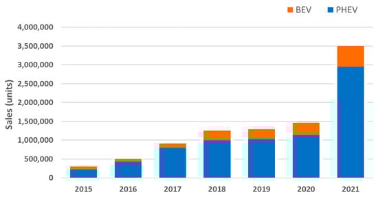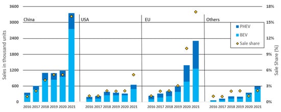 BEV and PHEV sales from 2016 to 2021 in different regions in the world [].