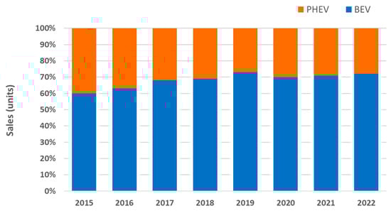 Figure 3 depicts the evolution of the ratio between all-electric and plug-in hybrids for global annual sales of plug-in electric passenger cars between 2016 and 2022 [].