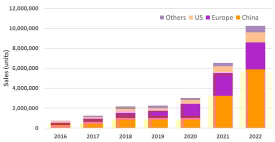 China has emerged as the undisputed leader in EV adoption and manufacturing over the past decade. The Chinese government has implemented strong supportive policies, provided enormous public investment, and cultivated a robust domestic EV supply chain. As a result, China’s EV market has grown exponentially in recent years. As illustrated in Figure 6, EV sales in China soared from just over 330,000 units in 2016 to 3.5 million units in 2021, an 11-fold increase in only 6 years [].