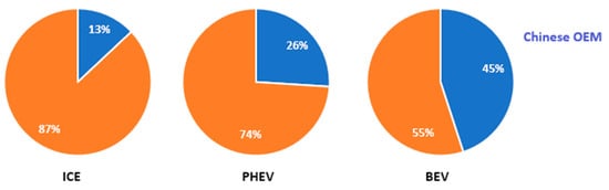 Chinese OEMs’ contribution to the global market for Internal Combustion Engine (ICE), PHEV and BEV [].