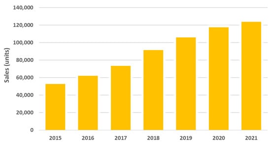 As shown in Figure 8, EV sales in Japan have risen steadily from 56,000 units in 2015 to over 109,000 units in 2021 []. The compound annual growth rate over that period was 14%. HEVs still dominate Japan’s electrified vehicle sales, but EVs are beginning to gain market share, reaching 1.1% of total vehicle sales last year [].