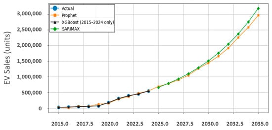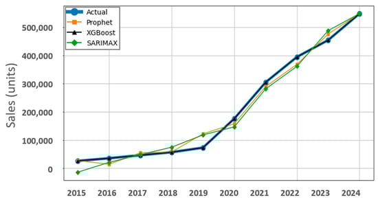 In order to compare the above three models, the UK’s actual and predicted EV sales forecasted by each model for the period 2015–2024 are compared in Figure 10. As seen in Figure 10, despite their methodological differences, the three models show similar predictions over 2015–2024 primarily due to three factors: (1) the strong upward trend in EV sales dominates the data, making it easier for all models to fit; (2) key drivers like charger density and time have high explanatory power across all models; and (3) the models were trained and evaluated on the same input features over a limited historical window. Divergences become more apparent in longer-term forecasts, where the structural assumptions of each model play a larger role.