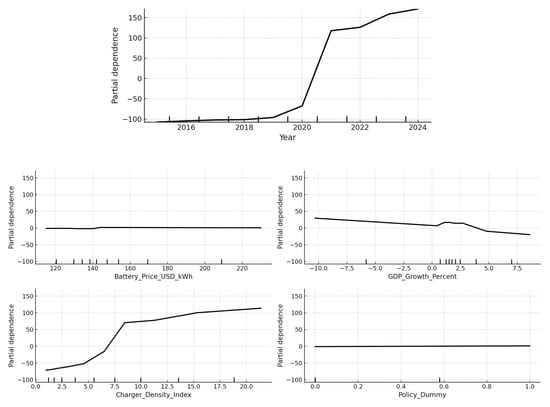 The goal here is to assess the influence of each factor on the EV sales, based on the historical data (2015–2024). Hence, the partial dependency of the UK sales on different factors over this sales duration is plotted in Figure 11. According to the results, “Year” has the most impact on the sale, followed by “Charger Density Index”. Battery pack price and policy have negligible effects. The feature importance values and ranks of each parameter are calculated based on the feature_importances_attribute of the trained XGBoost model and are listed in Table 5.