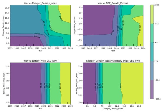 To further examine interactions between influential factors, two-dimensional partial dependence plots using the trained XGBoost model are shown in Figure 12. These plots show how combinations of key features jointly impact the model’s predicted EV sales from 2015 to 2024. For each plot, the surface is derived by marginalizing over all other variables while varying the selected feature pair. The color gradient encodes the average predicted EV sales value: warmer tones (yellow) indicate higher predictions, while cooler tones (blue) denote lower values. These visualizations reveal important synergies, such as the compounded effect of charger density and time progression on EV adoption. In addition, Table 6 presents the interaction analysis of UK EV sales (2015–2024) based on the XGBoost model. Consistent with Figure 11, Year has the greatest impact on EV sales, followed by the Charger Density Index.