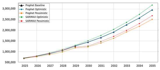 As the last part in this research, the scenario forecasts for 2025–2035 are investigated (see Figure 14 ) using both Prophet and SARIMAX, under two assumptions: