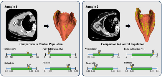Deltoid segmentation and quantification analysis for two sample patients. Note that the yellow regions in the deltoid pictures represent fat (based on Hounsfield unit values ranging from −190 to −30); whereas, the red regions in the deltoid pictures represent healthy muscle tissue (based on Hounsfield unit values ranging from −29 to 150). Patient 1 (left) has low fatty infiltration with a high deltoid volume. Patient 2 (right) has a lower deltoid volume and a higher degree of FI. The pipeline includes the deltoid characteristics of 783 shoulder arthroplasty patients, where the distribution of metrics can be used to gauge the characteristics of a given patient relative to a broader cohort.
