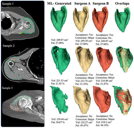 Figure 2 depicts the deltoid image analysis for two representative patients and reports the deltoid muscle size, shape parameters, volume, and fatty infiltration calculated from the ML-generated masks. For patient sample 1, the deltoid presented with low fatty infiltration and a large muscle volume. For patient sample 2, the deltoid presented with a substantial amount of fatty infiltration. Figure 3 depicts the ML-generated and surgeon-corrected masks for three samples: two requiring minor corrections and one requiring a major correction. For patient sample 3, the deltoid required a major correction, perhaps due to the high degree of fatty infiltration in the posterior deltoid (Figure 3).