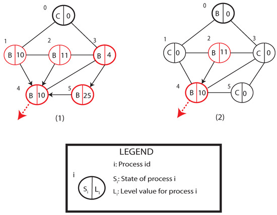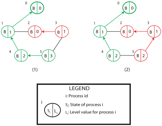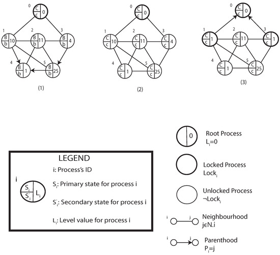 Practically, applications start in an arbitrary initial system configurations, where the processes’ states are not known [21]. Starting in an arbitrary system configuration, some nodes/processes may experience partial failures while others continue to work as expected [22]. In addition, data due to arbitrary initialization and its transmission can expose the distributed systems to potential safety risks such as unauthorized access and malicious attacks [23,24,25,26]. Therefore, an algorithm that does not require initialization needs to ensure that the processes that execute the algorithm are free of the interferences caused by arbitrarily initialized processes. For instance, in a broadcast algorithm, a process that received the broadcast with neighbors that did not receive the broadcast may experience interferences by the arbitrarily initialized processes and may prematurely end the broadcast.