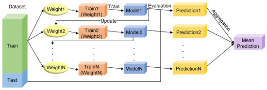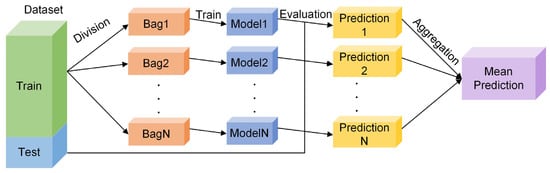 Ensemble learning is a method of combining multiple basic models to create robust and accurate models [20], mainly by building and combining multiple learners to solve a single prediction problem. The core concept of the ensemble method is that by combining the predictions of multiple models, it can improve the accuracy and robustness of the prediction, reduce overfitting, and improve the generalisation ability of the model. Ensemble learning is primarily divided into two methods, namely, bagging and boosting. Figure 1 and Figure 2 illustrate its schematic diagrams.