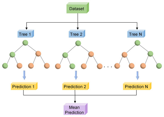 Random forest algorithm is a further development based on bagging, which has high accuracy in classification and regression [23]. As shown in Figure 3, the random forest algorithm introduces ‘randomness of feature selection’ in the training process of the decision tree; that is, at each split decision, instead of selecting the optimal feature from all features, the optimal feature is selected from the random subset of features for splitting. This improvement increases the diversity of the model and improves the generalisation ability whilst effectively reducing the risk of overfitting [24].
