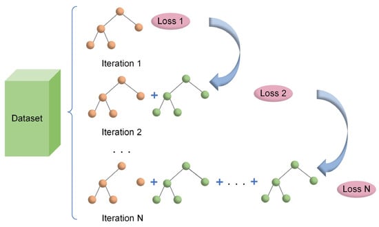 Bagging is a parallel integration method that solves the scattering problem of prediction models by including additional training data [21]. It is primarily used to reduce the variance of model prediction, thereby improving its stability and accuracy. It adds robustness to the final decision by creating multiple models’ ‘integration’; a typical example is the random forest algorithm [22]. In boosting, which trains multiple weak learners in series, each model attempts to correct the errors of the previous model. The key idea of boosting is to combine multiple models with weaker performance into a powerful overall model. Its typical representatives are XGBoost, AdaBoost, and CatBoost.