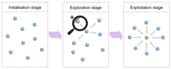 (1) Dynamic phase switching mechanism: The optimisation process is divided into three stages: initialisation, exploration, and exploitation. Each phase adopts a differentiated update strategy, supporting the dynamic adjustment of search behaviour along with the algorithm’s progress, thereby enhancing global exploration capability and convergence efficiency.