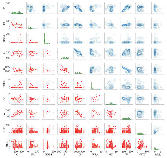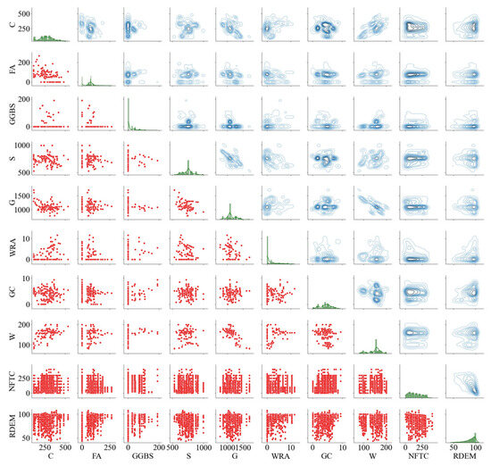 To show the relationship among the variables in the dataset, the scatter plot matrices of relative dynamic elastic modulus and mass loss rate are drawn, respectively, as shown in Figure 6 and Figure 7. A scatter plot matrix is a data visualisation tool used to exhibit binary relationships between multiple variables in a single view; it can help identify relationships between variables, distribution patterns of data, and potential outliers [29]. The diagonal graph shows the frequency distribution histogram of the data distribution of a single variable. The upper half of the diagonal shows the joint probability density plot of the two variables. The darker colour indicates denser data points in this area, and the sparse area far away from the main density area may indicate outliers. The graph in the lower half of the diagonal shows a scatter plot of the relationship of the two variables.