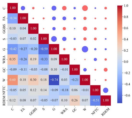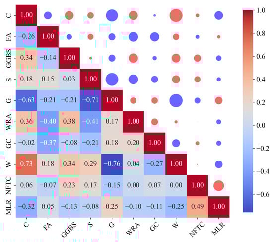 To ensure the accuracy of the model and avoid the problem of multicollinearity, the correlation between input variables should be less than 0.8 [30]. To further verify the correlation between the selected features and the prediction indicators, as shown in Figure 8 and Figure 9, a heatmap of Pearson correlation coefficients is used to display the linear relationships between variables. Pearson’s correlation coefficient is a statistical indicator that measures the degree of linear correlation between two variables. When the two variables move in the same direction, the value is positive; when the two variables move in opposite directions, the value is negative. Each grid in Figure 8 and Figure 9 represents the correlation coefficient between the two variables. The range of the coefficient is from −1 to +1. Red represents positive correlation; blue represents negative correlation, and the depth of colour represents the strength of correlation. In Figure 8, RDEM shows a moderate negative correlation with NFTC, and RDEM shows a low correlation with the other parameters FA, GGBS, S, G, WRA, GC, and W. In Figure 9, MLR shows a very strong negative correlation with W, MLR shows a moderate positive correlation with GGBS and WRA, and MLR shows a low correlation with the other following parameters: C, FA, S, G, and GC.