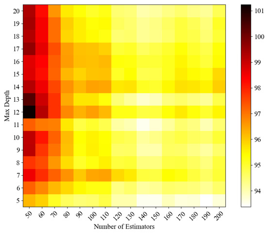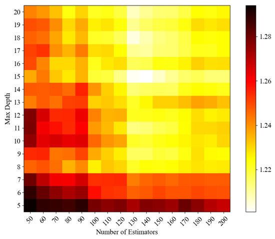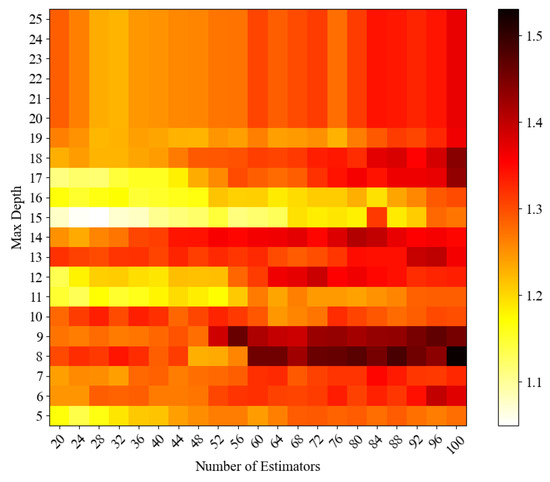 A mean square error heat map is a chart used to visualise the relationship between model parameters and their performance. During the hyperparameter tuning process of ensemble learning models, the heat map provides an intuitive way to observe the impact of two different hyperparameter configurations on the prediction error of the model. Both the RF and AdaBoost models select two main hyperparameters, n_estimators (the number of trees or weak learners), and max_depth (the maximum depth of trees or weak learners). After experimental adjustment, the appropriate hyperparameter range is selected. The mean square error heat map of RF regressor and AdaBoost is drawn, as shown in Figure 11, Figure 12, Figure 13 and Figure 14, to demonstrate the influence of the two hyperparameter combinations on the performance of the model. The colour change in the figure indicates the size of MSE, and the colour changes from red to yellow.