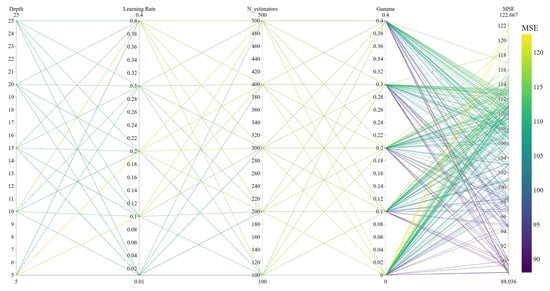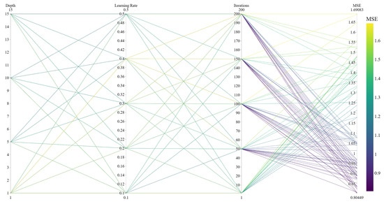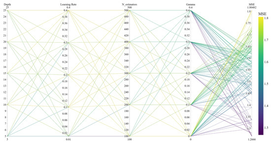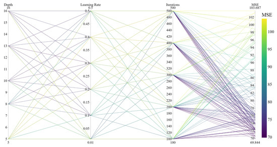 The parallel coordinate graph allows the visualisation of multi-dimensional data and is very suitable for displaying the results of multi-parameter configuration. The CatBoost model selects three important parameters: iterations (number of trees), learning_rate (learning rate per iteration), and depth (maximum depth of number). The XGBoost model selects four important parameters, namely, n_estimators (number of trees), learning_rate (learning rate per iteration), gamma (minimum loss reduction when splitting the tree), and max_depth (maximum depth of number). Parallel coordinate plots are drawn, respectively, as shown in Figure 15, Figure 16, Figure 17 and Figure 18, to illustrate the effects of the four parameter combinations of the XGBoost model and the three parameters of the CatBoost model on model performance. Each parameter dimension in the figure has a vertical line, each line represents a parameter and each connecting line represents the result of a parameter combination. The colour change in the line represents the size of MSE. When the colour approaches yellow, the error increases, whereas when the colour approaches purple, the error decreases. When selecting parameters, the connecting line whose colour is biased towards purple should be selected, and the appropriate parameters should be determined through experimental comparison.