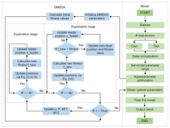 A single ensemble learning model typically relies on manual adjustment in the selection of hyperparameters, which have the problems of low efficiency and difficulty in determining the optimal solution. Moreover, the performance of the model is very sensitive to hyperparameters, and incorrect parameter selection may lead to overfitting or underfitting of the model. Therefore, using appropriate optimisation algorithms to systematically explore the parameter space and automatically determine the optimal hyperparameter combination can help improve the accuracy and robustness of the model. Figure 19 shows the flow chart of DMSOA optimising the hyperparameters of the ensemble learning model.