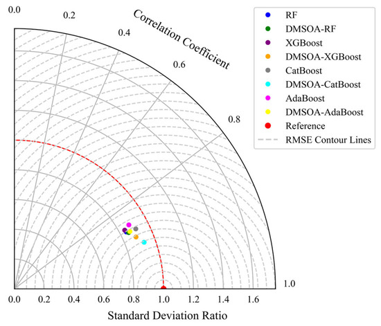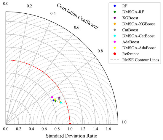 In addition, a Taylor diagram is a very efficient graphical representation to characterise the prediction performance of models. It evaluates models by combining multiple statistics, adding intuitiveness to the comparison between models; additionally, it can display statistical information in a single chart that generally needs to be represented by multiple charts [34]. Therefore, to show the predicted results through the models in Table 5 and Table 6 more directly, the paper uses a Taylor diagram to compare the prediction effects of different prediction models in Figure 20 and Figure 21. In the figures, the ratio of the standard deviation of the predicted value to the measured value is the radial distance from the origin. The correlation coefficient between the predicted value and the measured value is the angle in the polar diagram, and the root mean square error is the radial distance from the reference point. The red dashed line in the figure is the standard deviation of the reference data point. The model prediction close to this line has a standard deviation similar to the observed value, which means that the model can capture the variability of the data well. The angles of model points show the degree of correlation between their predicted and actual values, and models with angles close to 1 show high correlations. The dashed grey line represents the contours of the RMSE. Similarly, from the two Taylor diagrams, DMSOA-CatBoost tends to the reference point more and has the most outstanding performance.