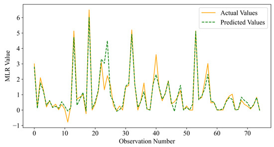 Figure 22 and Figure 23 are the comparative line charts of the predicted and true values of the DMSOA-CatBoost model on the relative dynamic elastic modulus and mass loss rate test set at a certain fold in the ten-fold cross-validation. From the figure, the predicted and true values are in good agreement, and the expected effect is achieved [35].