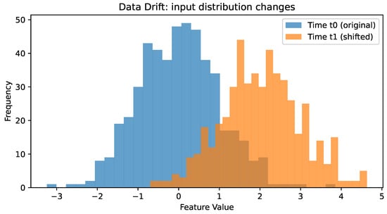 (Data Drift): It is a specific type of drift concerning changes in the distribution of the input data over time, without necessarily altering the underlying concept that maps inputs to outputs. It is also known as covariate shift or virtual drift. Formally, consider a supervised data stream of input–output pairs , where represents a feature vector and represents labels []. Data drift occurs when the marginal feature distribution changes; i.e., there exist times such that