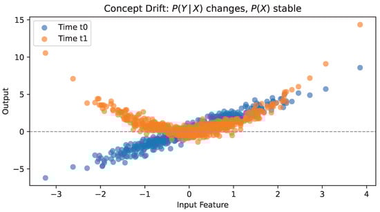 This is the hallmark of concept drift: the true decision surface moves even though the feature space the model sees stays put. A classifier or regressor trained on the blue relationship will project a straight decision boundary or regression line; when confronted with the orange regime, it will systematically mis-predict, for instance, by over-estimating outputs around and under-estimating them for larger .