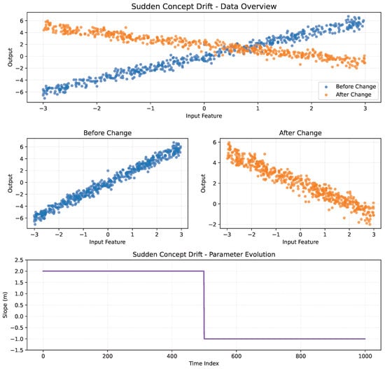 - Sudden drift: The relationship between inputs and outputs changes instantaneously at a specific point in time, as shown in Figure 3. The data overview panel demonstrates two distinct regimes: an initial positive linear relationship, in blue, abruptly replaced by a negative linear relationship, in orange, after the change point. This discontinuity is quantitatively confirmed in the parameter evolution panel, where the slope coefficient m exhibits a step change from to at time index 500, with no transitional states.