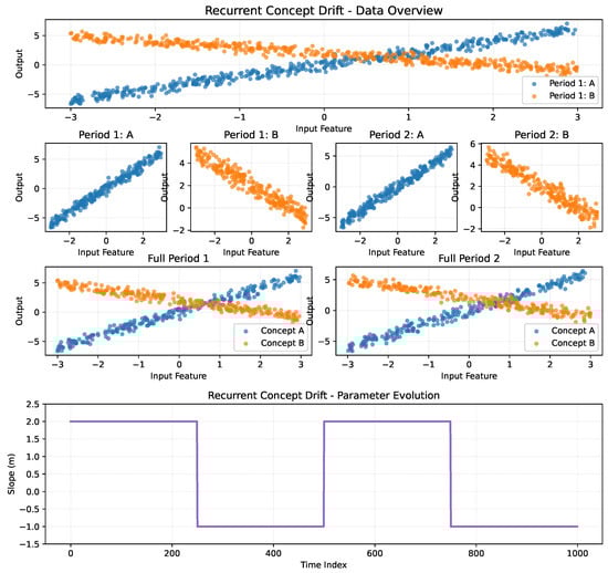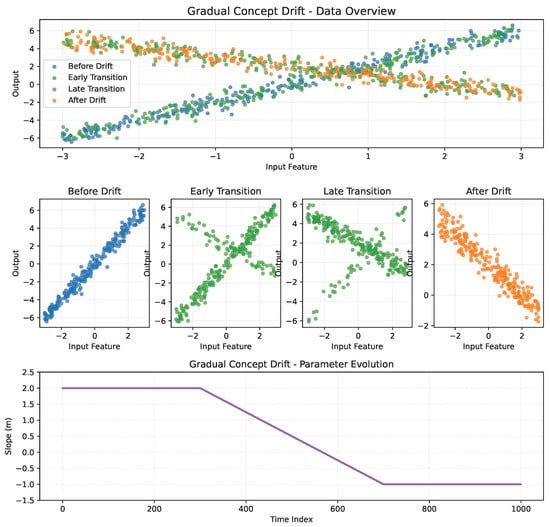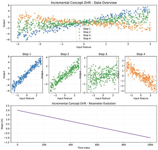 Figure 5. Incremental concept drift. - Recurrent drift: The system alternates periodically between distinct concepts, creating a cyclical pattern of change. Two stable relationships repeatedly alternate, as is visible in Figure 6: Concept A maintains a positive linear relationship (blue points), while Concept B follows a negative relationship (orange points). The parameter evolution panel confirms this periodicity through a square-wave pattern, where the slope coefficient alternates precisely between and every 250 time steps. This recurrent mechanism is clearly visible in both the full-period visualizations and in the square-wave slope pattern.