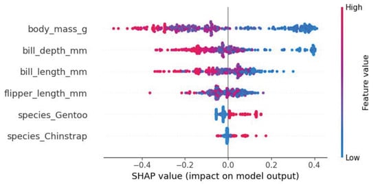 - SHAP (Shapley Additive Explanations): This method assigns each feature an importance value derived from Shapley values in cooperative game theory. The model’s prediction is treated as a “payout” fairly divided among features, ensuring that attributions sum up precisely to the difference between the actual and baseline outputs. It supports both global and local explanations.Figure 7 shows a SHAP summary plot for a random forest classifier trained with 100 trees to predict the sex of penguins. Every dot in the figure is a Shapley value; its vertical position marks the feature, its horizontal position represents the size and direction of that feature’s contribution for one bird, and its color encodes the raw feature value from low (blue) to high (red). The cloud of points therefore conveys two things simultaneously: the importance ranking (features are ordered from top to bottom by the spread of their dots) and the effect pattern (for example, higher body-mass values cluster on the negative side, showing that heavy birds push the model away from “female”). Because overlapping dots are jittered vertically, the reader also gets a sense of the distribution of effects within each feature. In one compact visual, novices can see that body_mass_g dominates the decision process, followed by bill_depth_mm and bill_length_mm, and can infer how low versus high measurements shift the predicted probability [].