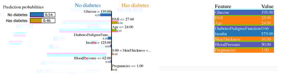 Figure 7. Shap example. - LIME (Local Interpretable Model-agnostic Explanations): This method explains individual predictions by training a simple surrogate model locally around the instance. This surrogate approximates the black box locally, highlighting influential features for a specific prediction. LIME has been designed to be applied locally.In Figure 8 this procedure is illustrated for a random forest classifier trained on a Diabetes dataset. The forest assigns a 0.73 probability of diabetes to a particular patient. LIME perturbs that patient’s eight clinical attributes (glucose, BMI, age, etc.), reevaluates each variant with the forest, and fits a weighted linear surrogate whose against the forest’s outputs is 0.92—evidence of high local fidelity. The bar chart shows that elevated glucose and body mass index are the dominant positive contributors, while a slightly below-average blood pressure exerts a small negative influence [].