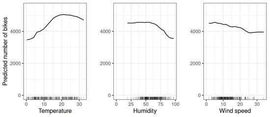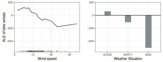 Figure 9. PDP example. - Accumulated Local Effects (ALE): This method improves on the PDP when features are correlated. The feature range is partitioned into data-driven intervals, local gradients are computed within each slice using only observed data points, and these gradients are accumulated into a centered curve. ALE therefore avoids the extrapolation bias of PDPs and remains computationally light. It is a global explanation method.Figure 10 illustrates the idea with a random forest model that predicts the number of bikes rented each day from weather variables. In the left panel, the ALE curve for wind speed dips steadily below zero, showing that stronger winds depress rental counts; the rug at the bottom reminds the reader that very high wind values are rare, so the slight uptick beyond 30 km is probably noise rather than a true reversal. The right panel reports the categorical main effect for the “weather situation”: relative to the baseline of good weather, misty conditions reduce demand modestly, whereas bad weather slashes expected rentals by more than six hundred bikes—both findings align with common sense. Because ALE can also be extended to two-way interaction surfaces, analysts can inspect, for example, how humidity modifies the temperature effect without re-plotting the main trends; the interaction plot shows only the additional joint influence, leaving the main effects undisturbed and easy to read [].