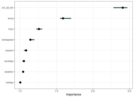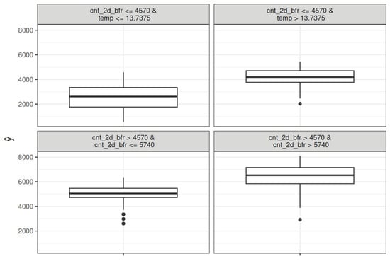 Figure 11. PI example. - Surrogate Models: Training proceeds by fitting an interpretable model—not to the true labels but to the predictions of a black box—so that the surrogate reproduces the original decision surface as closely as possible. The resulting tree offers a global sketch of the black box, while any root-to-leaf path can be read as a local, rule-based explanation.Figure 12 shows a CART surrogate that mimics a support vector machine (SVM) trained to forecast daily bike rental counts from weather and calendar features. Using the original training data, the tree is fitted to the SVM’s outputs and attains an on hold-out cases, indicating a good—though not perfect—approximation of the black-box behavior. The first split is on cnt_2d_bfr (rentals two days earlier); when this lagged count exceeds 4570, the model anticipates higher demand, and a subsequent split on temperature (>13 °C) refines the prediction further. The four terminal nodes are summarized by box-plots: moving from the top-left panel (cool day, low prior demand) to the bottom-right panel (warm day, very high prior demand), the median predicted rental count climbs sharply, visualizing in one glance how the two variables interact inside the SVM. By walking each path, a reader can translate the black-box logic into plain IF–THEN statements, while the overall structure of the tree conveys which features the SVM relies on most [].
