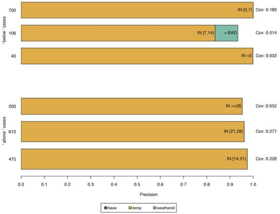 Figure 12. Surrogate model example. - Anchors: The model learns concise IF–THEN rules (anchors) for a target instance such that, with high empirical precision, any sample satisfying the rule yields the same prediction. Precision and coverage statistics accompany each rule, giving users a quantified guarantee of stability. Anchors supply local explanations centered on the rule’s coverage region.Figure 13 makes this concrete for a random forest classifier built from the bike rental dataset. The regression target (daily rental count) has been binarized into above versus below the trend line, and the forest is asked to justify six individual predictions. For every case, the anchor algorithm fixes one or two feature predicates—here mainly temperature buckets such as temp , occasionally augmented by weather = bad—and then generates synthetic neighbors by sampling the remaining features from the training set. If at least 95% of those neighbors inherit the forest’s original label, the predicate set is accepted as an anchor. In the plot each horizontal bar lies on a precision axis from 0 to 1: the right-hand end of every bar touches or exceeds the threshold, signaling that the discovered rule is highly faithful. The bar thickness encodes coverage; the thickest rules apply to over 20% of comparable days, while thinner bars cover only a sliver of the data space. That most anchors rely solely on temperature confirms, in an immediately readable way, that the classifier’s decision boundary is dominated by this single variable, with bad weather entering the rule set only when it is needed to secure high precision [].