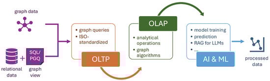 - Bonifati, A.; Özsu, M.T.; Tian, Y.; Voigt, H.; Yu, W.; Zhang, W. The Future of Graph Analytics. In Proceedings of the SIGMOD/PODS ’24: Companion of the 2024 International Conference on Management of Data, Santiago, Chile, 9–15 June 2024; pp. 544–545. [Google Scholar] [CrossRef]