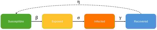 In the SEIRS model, there are four main parameters: , , , and . They represent the rate of transitioning from susceptible to exposed (), the rate of transitioning from exposed to infected (), the recovery rate (), and the rate of transitioning from the recovered state back to susceptible ().