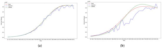 Truncated Newton [] computes a partial Hessian matrix to reduce computational complexity. It uses this truncated matrix to update the search direction, and a line search to determine the step size along this direction. BFGS [] is an algorithm that avoids directly computing the actual Hessian matrix of the objective function by iteratively approximating it. After each iteration and update to the approximation of the matrix, this new information is used to determine the step size and the search direction. There is also a limited memory version of this method that stores only a portion of past information to approximate the Hessian matrix []. The Levenberg–Marquardt [] algorithm iteratively updates the parameters of a model. It works by reducing the difference between the predicted data of the compartmental model based on the current parameter estimation and the real data across all compartments available in the current epidemic dataset that is being considered. It starts with an initial guess of the parameters and then updates them using gradient descent.
