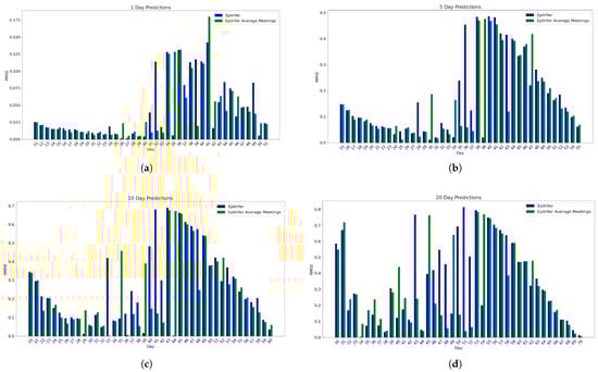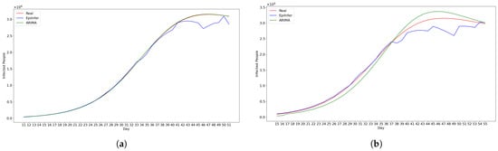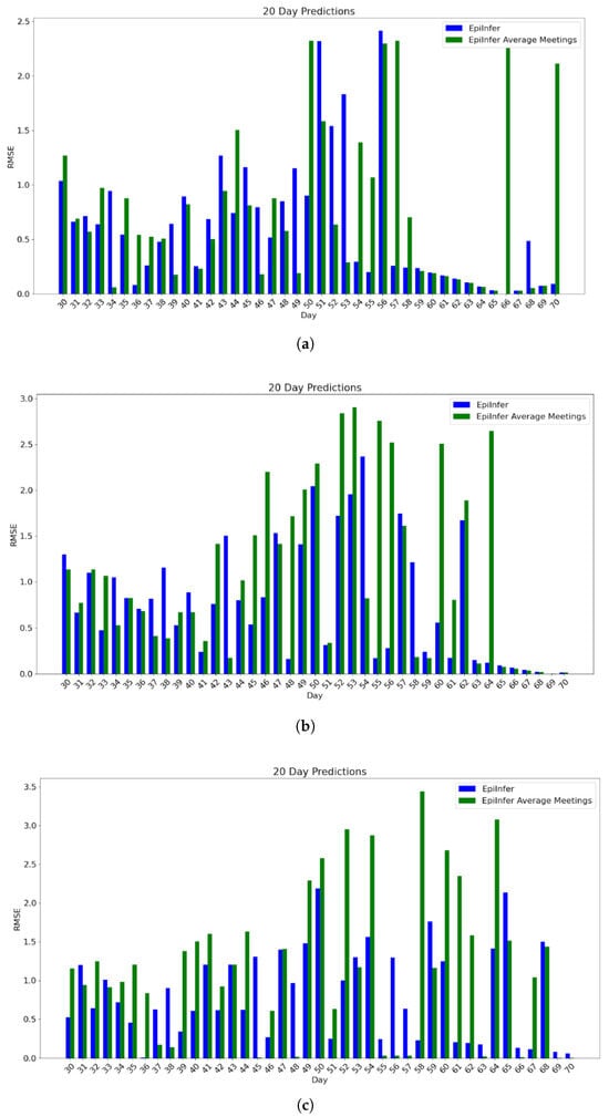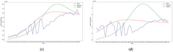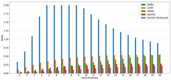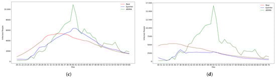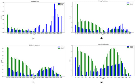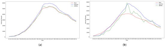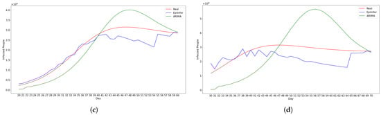 We selected ARIMA, a differential equation model with calibration, and LSTM as baseline models for comparison, choosing their hyperparameters based on those that demonstrated the best performance on both real and simulated data for 1-, 5-, 10-, and 20-day predictions. We implemented the ARIMA model using the statsmodels.tsa.arima.model library with hyperparameters , which turned out to be the best parameter settings. For the differential equation model, we used the SEIR model and fitted parameters using the default Levenberg–Marquardt algorithm provided by the lmfit library. The LSTM model was constructed as a single-layer recurrent neural network with 64 hidden units, followed by a fully connected output layer. It was trained using the Adam optimizer with a learning rate of 0.01. We compared these models with one another and with EpiInfer. For each model M, to predict k days in the future, we apply M to predict one day out in the future and then use that prediction as if it were a real value to predict two days out, and we keep going until k days in the future.