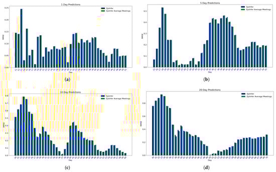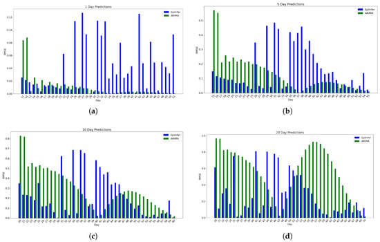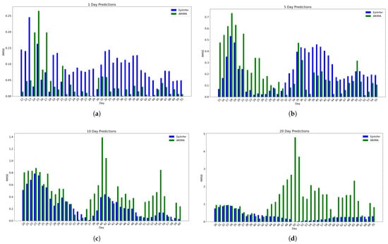 Using simulated data from the simulation engine EpiPolicy, these figures show the predictions from the two best methods ARIMA and EpiInfer. EpiInfer has a lower mean relative RMSE than ARIMA for 10- and 20-day predictions, while showing similar performance for 5-day predictions. Please see Table 1 for p-values and the confidence interval for each forecast length. (a) One-day predictions with 10–50 training days. (b) Five-day predictions with 10–50 training days. (c) Ten-day predictions with 10–50 training days. (d) Twenty-day predictions with 10–50 training days.