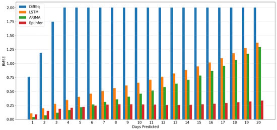 Both ARIMA and EpiInfer have lower Root Mean Squared Errors (RMSE) than LSTM or differential equation models regardless of how far in the future to forecast. Table 1 shows that ARIMA is better for forecasts up to 7 days in the future after which EpiInfer is better.