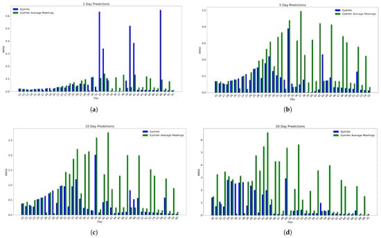 Figure 3, by contrast, shows the relative Root Mean Squared Error, RMSE, which is the square root of the squared relative errors ( , where is the prediction and y is the actual value) of the top two methods (EpiInfer and ARIMA) for days running between 11 and 70 days into the simulated pandemic. Predictions for each such day d are 1, 5, 10, and 20 days in the future (i.e., , , , ).