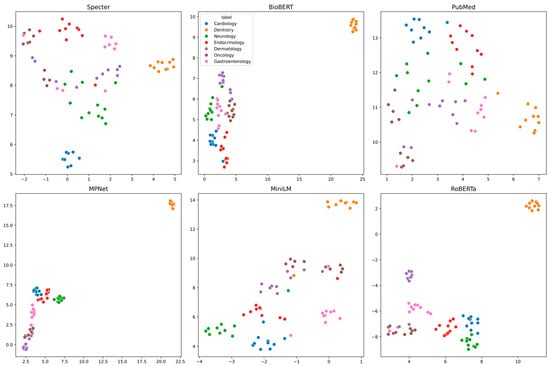 The ability of the sentence transformers to organize MeSH terms into semantically coherent groups corresponding to the seven medical specialties considered varied markedly across the evaluated models. Our analysis, which integrated qualitative visualization, cluster composition analysis, and quantitative metrics, revealed a distinct performance hierarchy. A top tier of models, including the domain-specific BioBERT and the general-purpose MPNet and RoBERTa, proved highly effective, generating robust and accurate clusters that aligned closely with the ground-truth specialties. In stark contrast, other models, most notably PubMedBERT and BioClinicalBERT, failed to produce meaningful groupings, resulting in disorganized clusters with little correspondence to the actual medical domains. Occupying a middle ground, a light-weight model like MiniLM demonstrated partial success, effectively separating some specialties while conflating others. The subsequent sections provide a detailed examination of these outcomes, beginning with a qualitative assessment of the embedding spaces.