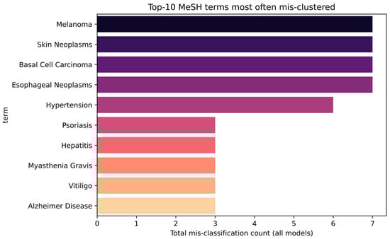 Figure 3 displays the top-10 MeSH terms that were most frequently misclustered. The analysis shows a clear pattern: four terms were misclassified by all six of the evaluated models. These were “Basal Cell Carcinoma”, “Melanoma”, “Esophageal Neoplasms”, and “Skin Neoplasms”, which semantically indeed overlap different specialties. These terms are not random mistakes but faithful reflections of their dual taxonomic status. In the MeSH hierarchy, Melanoma (D008545) is a child of Skin Neoplasms (D012878), while Basal Cell Carcinoma (D002280) is likewise nested under Neoplasms and cross-referenced to the skin tree. Clinically, these entities reside at the dermato–oncologic interface: they are skin cancers diagnosed and often treated by dermatologists, yet their pathology, staging, and systemic therapy paradigms are quintessentially oncologic. The top-performing encoders therefore capture a real conceptual overlap rather than committing a semantic error; the apparent “mis-classification” emerges only because our evaluation forces a single-label mapping that ignores legitimate cross-disciplinary ties. The Cardiology term “Hypertension” was also a difficult concept, being misclassified by five models. Other terms that proved consistently challenging for a smaller subset of encoders (two to three models) included Neurology concepts like “Alzheimer Disease” and “Parkinson Disease”, and Dermatology terms such as “Vitiligo” and “Rosacea”. This term-level audit demonstrates that clustering errors were not random but were concentrated on concepts that lie at the established clinical and scientific interface between different medical fields, confirming that the models’ semantic spaces reflect these genuine conceptual overlaps.