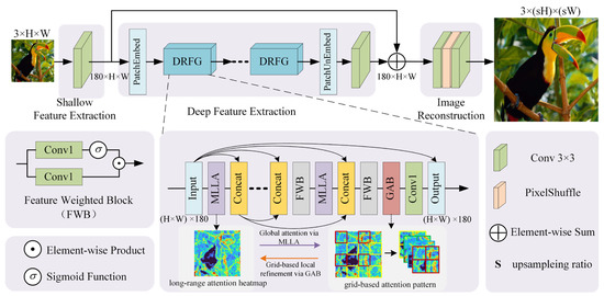 The overall structure of the DRFAN is illustrated in Figure 1 and primarily comprises three parts: shallow feature extraction, deep feature extraction, and image reconstruction. Specifically, the deep feature extraction module (referred to as the DRFG network) is composed of multiple Mamba-like linear attention (MLLA) blocks, a Grid Attention Block (GAB) [39], and residual structures. We will elaborate on these methods in the following sections.