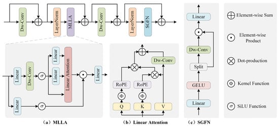 The structure of MLLA block, including (a) MLLA, (b) Linear attention, and (c) SGFN.