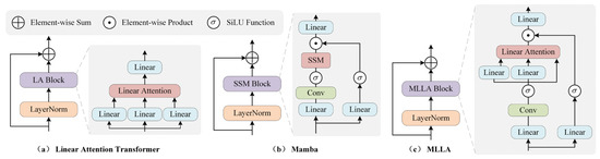 To overcome these challenges, researchers have progressively investigated several innovative mechanisms, such as linear attention [18] and Mamba [19]. Linear attention reformulates traditional self-attention by linearly decomposing the dot-product operations between query (Q) and key (K) features, effectively reducing computational complexity from O(N2) to O(N). While this approach mitigates computational overhead, it compromises the model’s capacity to capture comprehensive global contextual dependencies, resulting in unstable performance across diverse tasks and data distributions. Mamba, an architecture derived from state space models [20,21,22], integrates the complementary strengths of recurrent neural networks [23,24] and convolutional neural networks. This hybridization preserves its ability to model long-range dependencies while achieving substantial computational efficiency gains. However, its multi-directional scanning strategy is limited in non-autoregressive tasks, and issues such as local pixel forgetting and channel redundancy impede its pixel-level accuracy in image super-resolution. The Mamba-like linear attention (MLLA) model [25] addresses these limitations by establishing a theoretical bridge between Mamba and linear attention, effectively combining the parallel processing efficiency of linear attention with the adaptive feature selection capability of SSM. Operating at linear complexity O(N), MLLA selectively prioritizes critical detail features during reconstruction. Crucially, it circumvents the recursive computation demands of SSM’s forget gates, thereby eliminating a key bottleneck in high-resolution image processing. This framework represents a paradigm shift, balancing computational tractability with enhanced reconstruction precision.