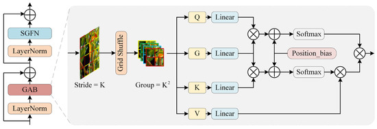 The GAB facilitates cross-region similarity modeling for enhanced image reconstruction while employing a post-normalization strategy to improve network training stability. The GAB architecture comprises a grid-MSA layer and an SGFN layer. The computational workflow of GAB is expressed as follows: