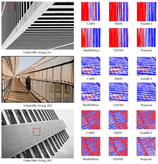 As shown in Table 1, Model B consistently outperforms the baseline Model A across all datasets, with only a slight increase in parameter count. The most notable gain is observed on Urban100, where the PSNR improves from 25.95 dB to 26.14 dB and the SSIM improves by 0.0052. This highlights the SGFN’s strength in structured feature generation and its ability to better capture local geometric and textural patterns. The substitution of MLP with the SGFN proves beneficial in dense residual contexts, reducing channel redundancy and enhancing representational capacity.