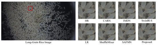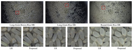 To further highlight the effectiveness of our model, we also validated it using rice images collected from a real processing environment. This domain-specific collection contains 10 high-resolution rice images, each with a resolution of 4096 × 2160. The dataset comprises images of polished round-grain rice, polished long-grain rice, and semi-polished long-grain rice, among the semi-polished images including some substandard grains such as broken rice and chalky rice. Although the number of images is limited, each image contains hundreds to thousands of densely packed rice grains with significant intra-image diversity. The grains often appear adhered or overlapping, forming complex texture patterns that pose challenges for local structure reconstruction. Unlike public datasets with diverse scenes and backgrounds, this dataset was acquired under controlled conditions (uniform lighting, background, and camera settings), ensuring high consistency while preserving grain-level variability. To facilitate the execution of the SR task, each image was partitioned into LR patches of size 512 × 240, ensuring smooth model operation during testing.