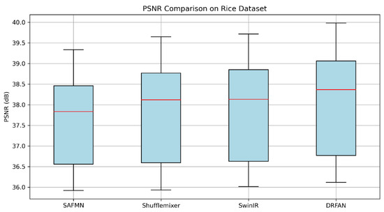 Box plot comparison of PSNR results for different lightweight SR models on the rice dataset. Red lines show the median PSNR of each model.