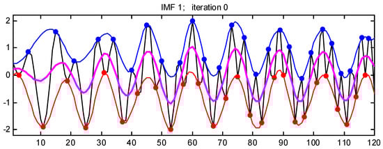 The initial signal depicted by the black line in Figure 1 is processed using a cubic spline interpolation approach that identifies the local minimum and maximum values. This process generates lower and upper envelope lines, which are represented by the red and blue lines in Figure 1, respectively.